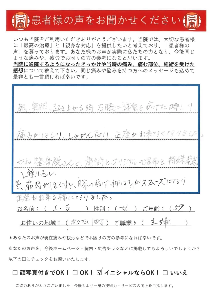 筋肉がほぐれ、膝の曲げ伸ばしがスムーズになり、正座もできるようになりました。