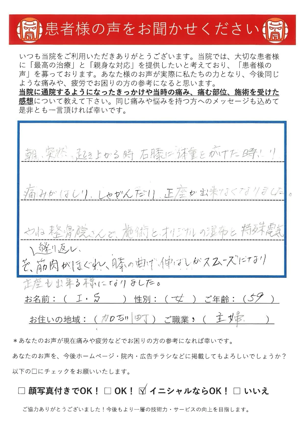 筋肉がほぐれ、膝の曲げ伸ばしがスムーズになった 加古川町 / I・S / 59歳 / 女性 膝 症状部位 膝 症状 膝の痛み 患者様の声 朝突然起き上がる時、右膝に体重をかけた時痛みが走り、しゃがんだり正座ができなくなりました。 やね接骨院さんで施術とオリジナルの湿布と特殊電気を繰り返し施術いただき、 筋肉がほぐれ、膝の曲げ伸ばしがスムーズになり、正座もできるようになりました。 ※患者様個人の感想であり、効果効能を保証するものではありません。 Prev 一覧へ戻る Next